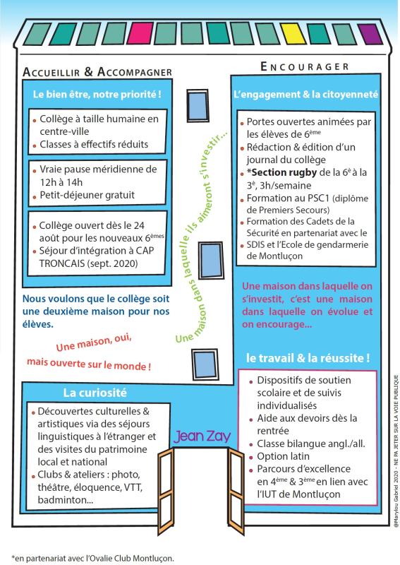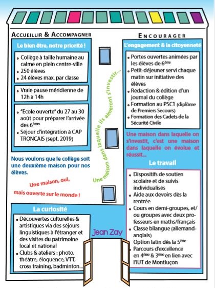 Nous habitons au centre de la France dans le département de l’Allier (03) à Montluçon. Nous sommes élèves au Collège Jean Zay (petit établissement d’environ 250 élèves). Notre collège est composé de 3 bâtiments A, B, C dont 3 salles informatiques et un CDI (centre de documentation et d’informations). De plus, nous avons un très grand gymnase à l’extérieur de l’établissement ainsi qu’un foyer où nous pouvons nous détendre, jouer au baby foot ou aux jeux de société , écouter de la musique.